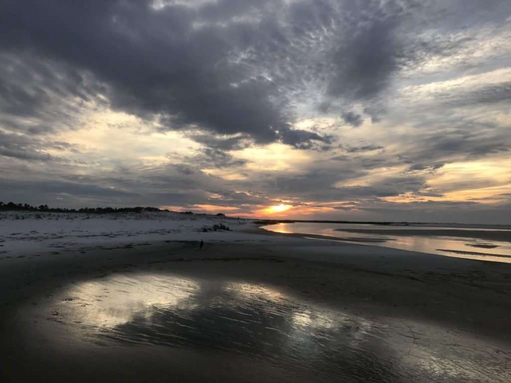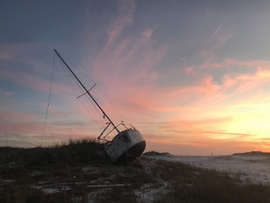 After taking Ziggy ashore to relieve himself, we gathered together aboard Livin’ the Dream for a full Thanksgiving feast consisting of a gigantic chicken (as no boat oven sized Turkeys could be found), from scratch stuffing, mashed potatoes and gravy, corn, and most importantly, good company. Together with Livin’ the Dream, we dinghied to shore where we walked the beach finding sand dollars and playing ball with Ziggy as the sun set over a coastline which only a few weeks prior had been ravaged by Hurricane Michael. We then reconvened for home-made pumpkin bars. With our bellies stuffed, Ziggy and I headed back to Albion knowing that the following day, we would go our separate ways, to hopefully see each other again in Key West. The next morning, we sailed outside in the Gulf, and I took a screenshot of the chartplotter as the AIS showed Livin’ the Dream’s course diverting to the southeast while I headed towards Apalachicola. I planned to enter via Government Cut, stay at a marina to recharge the batteries, then head out the next afternoon for an overnight crossing to Cedar Key, arriving sometime on Thanksgiving morning. However, in consistency with the sentiments of “the best laid plans of mice and men,” we went from the trip high of our memorable Thanksgiving, to the low of running aground mid channel in Government Cut, though no mention of shoaling (supposedly a remnant of the hurricane) completely closing off the channel was noted in Active Captain, Waterway Guides, Nav Alerts, or even mentioned in my multiple conversations with the marina in Apalachicola.  In contrast to the tow received up the Ohio River (an event about which I need to dedicate a full post), we were greeted by a tow who manhandled my beloved Albion through nearly half a mile of shoaling with no concern or care for the boat or it’s beleaguered skipper, ultimately leaving us at anchor completely unprotected from the strong winds and waves ripping through the bay a far distance from the shore which Ziggy desperately needed to visit. Tired, frustrated, worried about our boat after its beating at the hands of TowBoat/US, and knowing that rather than crossing over to Cedar Key – a milestone leading us closer to warmer weather and the Keys, we would be spending Thanksgiving motoring through the ICW to Carabbelle where we would, having now lost our weather window, wait for the opportunity to cross.  When we arrived in Carabbelle, it was defined by melancholy as this was the first time in months slipped a marina where we did not know anyone, and it meant that we would be delayed in our crossing, and therefore unable to catch up to Livin’ the Dream. Needless to say, the date on which Thanksgiving was celebrated, was one marked by loneliness and defeat.