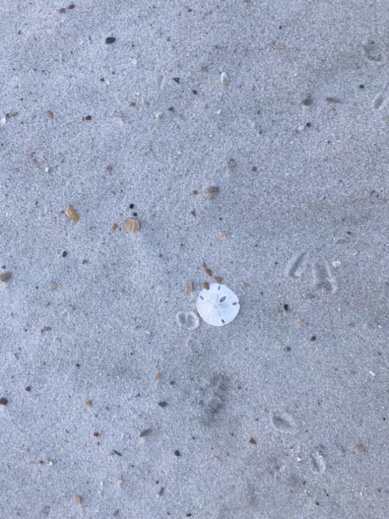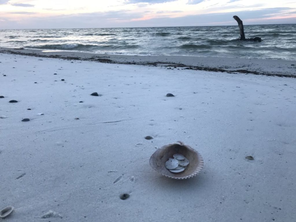 Collecting sand dollars along the beach at sunset