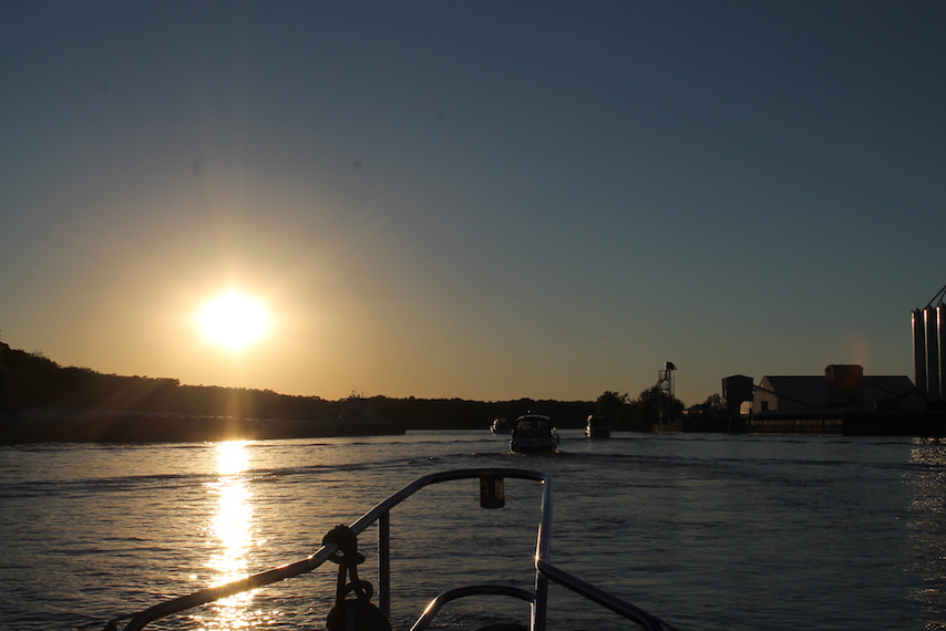As I write this, we are in Peoria, Illinois at a “free” marina with no facilities, after having traveled over 40 miles from an anchorage behind an island, where we also had no facilities, and after having spent nearly 9 hours traveling under the hot sun to arrive at an anchorage that at first glance seemed too shallow to enter and occupied by barges. However, with the advice of the extremely helpful Jeremy from Heritage Harbor Marina, we finally settled into a comfortable spot anchored ahead of the tows in 8-11’ of water. This was an anchorage I was looking forward to, being at anchor would force me to sit and read or write, and the island behind which we were nestled would offer a place to explore off-leash with Ziggy. However, when I pulled back on the throttle, the handle had little resistance and moved far beyond its normal range. After opening up the engine access, it was evident that the bracket which secures the throttle cable had come loose and fallen off the engine, leaving the throttle cable hanging out of place. Thankfully, I was able to find the screw and nut to refasten the bracket and secure the throttle cable – all while wedged against a motor that was hot from having been run for 9 hours down the river, on an already hot and humid day. With what would have been a relatively simple fix seemingly completed, it should have just been a matter of shutting down the engine, and moving on with the evening. To the contrary—the engine would not idle down below 1100 rpms, even when manually moving the throttle arm on the motor. I called a knowledgeable source, but he didn’t know what would be the cause other than to adjust the screw on the throttle cable. After playing around with the throttle cable and the throttle arm and stuck with the high rpm’s, I simply decided on loosening the idle screw slightly, which allowed the throttle arm to move a bit further forward and idle down the motor. Is that the correct fix? I don’t know – and to be honest, I doubt it, but it accomplished what needed to be accomplished, and the fact that we are in Peoria tonight demonstrates that, even if only temporarily, it worked. Hopefully ahead we can find someone who is actually qualified to poke around diesel engines to inspect the throttle system. After a long day tolling down the river and with the delay from working on the motor, Ziggy was well overdue for a much needed and earned “shore leave.” The shady “beach” of the island looked intriguing, but after dingying to its shores, the leaves of three and seeming paradise for ticks and other less than desirable bugs led us to venture down river to the nearby town’s boat launch where we found a shady spot of grass and a dingy public restroom with a door that wouldn’t lock. But, it was shade, and a bathroom. Upon returning to the boat, with the chartplotter dimmed to reduce the thriving colony of mosquitos encircling its glow, we settled in, dirty, sticky, and hot, for some much needed sleep, with only the humidity and smell of the nearby feed elevator wafting through our windows. Thankfully, during the night it did cool down, and we slept well at our little anchorage. Needless to say though, another day passed without writing in my journal, let alone composing something worthy of posting to the blog. But therein lies the problem, we are roughly three weeks and 300 miles into this “dream” adventure and I am yet to post any updates to the blog. Not out of laziness or apathy, but sheer exhaustion – many times I have tried to squeak out a post, but the quality just was not there. I went into this trip exhausted –from studying for and taking the LSAT, to all the research and time that went into the systems upgrades, to provisioning the boat etc. And now that we are underway, the portion of the trip where we should have been able to sail and enjoy the small towns of Lake Michigan was characterized by stormy weather, rough seas, wind in the wrong direction, and rain. From there, it has been pushing to accomplish roughly 40 miles daily on the rivers, which rather than being cold as nearly everyone told me they would be, have been hot and sticky. Add to that, nearly every day has been plagued with some sort of project requiring attention, be it changing the oil as a result of the last mechanic putting on an oil filter that didn’t fit correctly, the water system springing a leak, the newly installed AIS needing the antenna replaced, the engine running slightly hotter than normal, the AC not wanting to prime, days like yesterday, and the constant petulant hour meter that doesn’t want to roll over – plus, trying to plan ahead our travels and figure places to stop with the uncertainty of how long it will take to get though each lock all while knowing we can only travel 6 knots and are therefore unable to make up any lost time due to lock delays – thus far, we have made decent travel progress, but at the expense, as Sterling Hayden so eloquently put it, “not a usable word was written.”