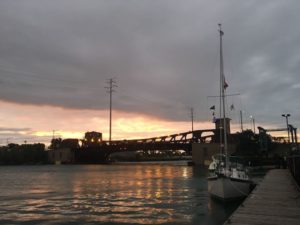 Even though we have the AC running to cut the edge off of another hot and humid day as I sit down to crank out this update, which may not be the most eloquent of pieces, yet will hopefully suffice for those who seem to think this trip has so far consisted of sipping umbrella drinks at various yacht clubs while I sit and write blog posts from the comfort of a shaded table with a view of the ocean. In reality, I am tired, hot, in need of a shower, hoping the nearby public bathrooms will open before we head out in the morning, and concerned that the sign at the ramp leading to the docks stating, “CAUTION COMBINED SEWER OVERFLOW Diluted Sewage May Flow Into The River Here During And After Storms. Avoid Bodily Contact” may mean I am sucking Illini poo through my air conditioner – the permeating smell of sewage only adds to the ambiance of my view and umbrella drink – oh wait…the umbrella drinks are someone else’s trip.
