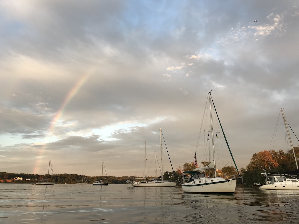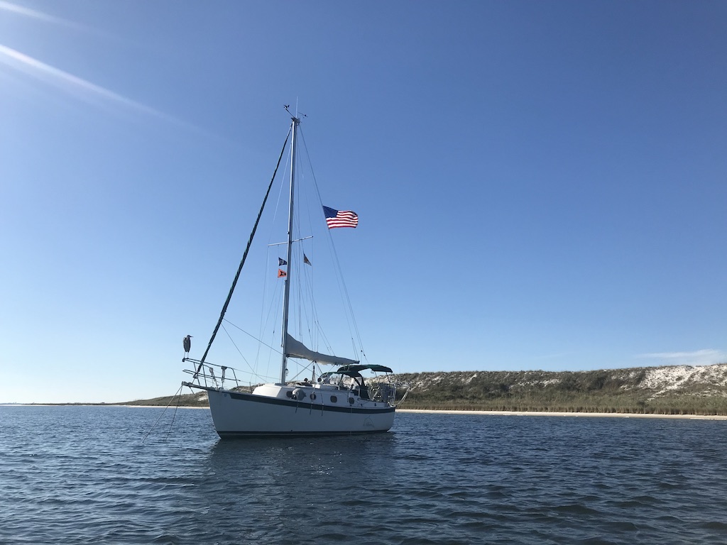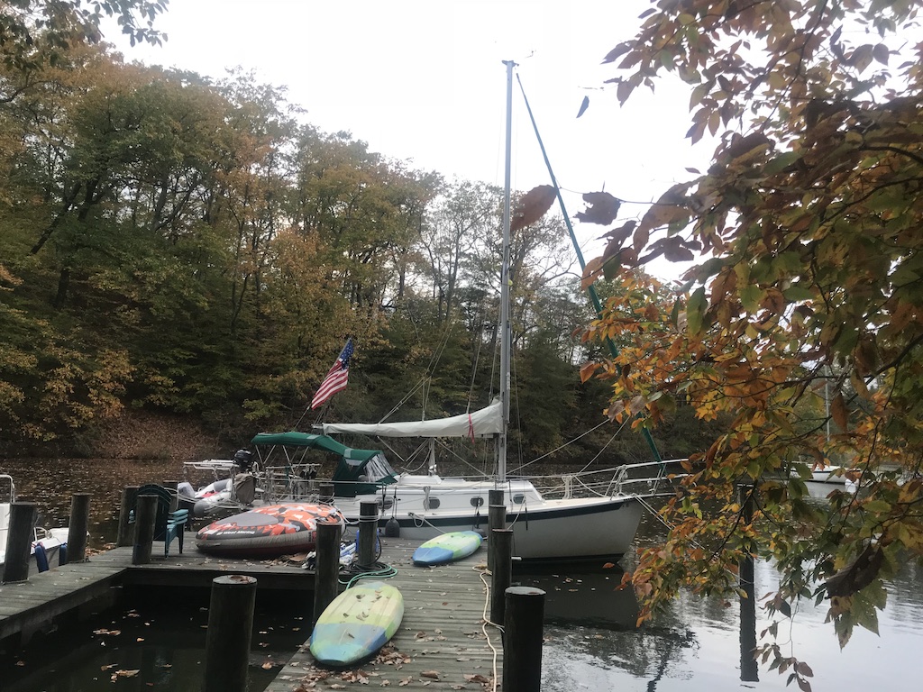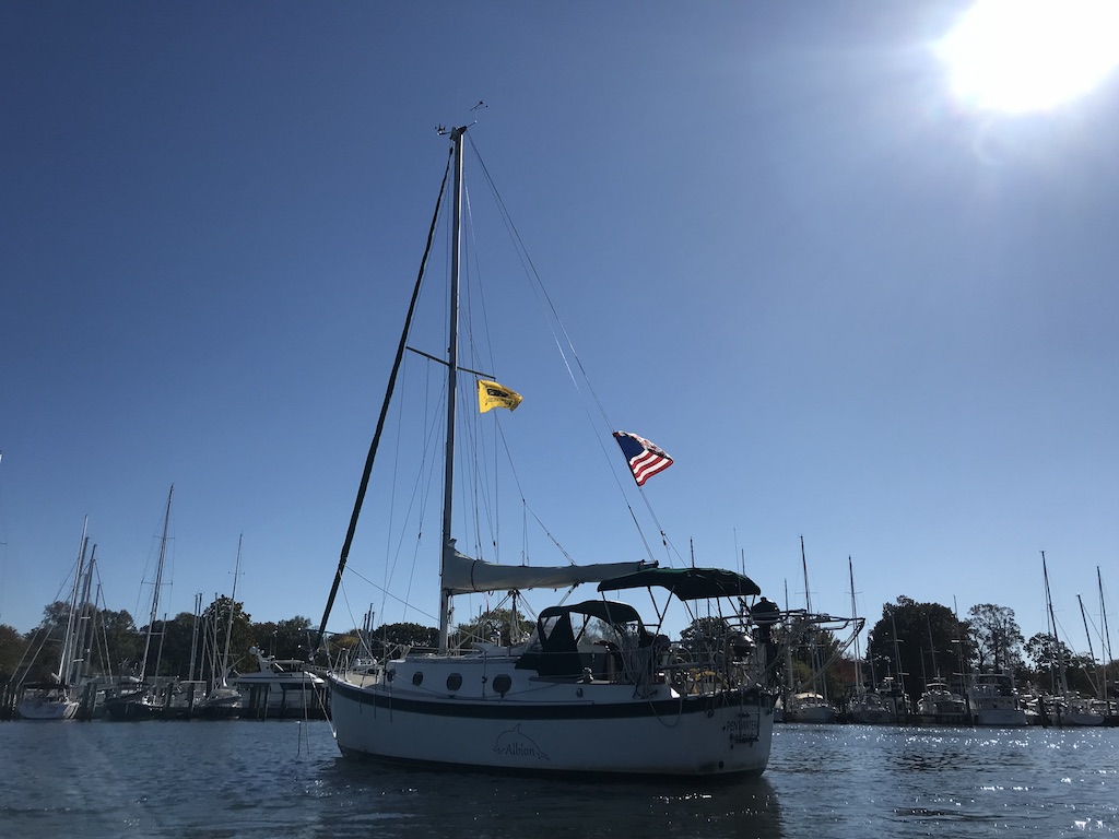 Here I sit, now on the other side of that sentiment – on the side of “the first day back home” and the “eve of returning to ‘reality.’”  Albion is tied at what is her new home, at least until she is pulled for the winter, and hopefully, next season.  Our arrival here was far from the serendipitous “crossing of our wake” celebration I anticipated when dreaming and planning this grand adventure two years ago – visions of Albion tied to the front dock of the little Pentwater Yacht Club, her flags flying proudly, and the sounds of friends and family celebrating, together, the experiences shared aboard Albion. Rather, her flags are down, pulled due to the winds passing through from a nor’easter. They are remnants of our journey; faded, tattered, and dirty. As I look at them, now draped over the back of the settee, I see that first day in Pentwater when they were hoisted in anticipation of the thousands of miles ahead. I see them proudly waving in the Garrison Bight mooring field after our long and rough passage into Key West. I see them flying in Bimini as the Bahamas courtesy flag was raised alongside. I see the red whipping thread used to re-stitch the torn Hope College Sailing Team burgee in Lee Stocking Island. I see the flags being hoisted again after successfully riding out Hurricane Dorian in Hilton Head. I see the piece of cheap cotton line used to tether the Hope Burgee to the Pentwater Yacht Club burgee – a temporary tie that lasted the entire journey. As I see them now, I know, they will never be flown as part of this grand adventure again. Albion will only be in the water a few more weeks before she is pulled for the season, and at most, there may be a couple day-sails squeezed in amongst apartment dealings, boat yard calls, applications, and the numerous other responsibilities that come with transitioning back into “reality” – most likely, no occasion for flags.