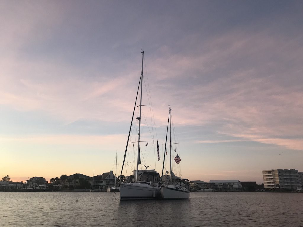 Albion and Livin’ the Dream rafted together in Destin, Florida – both boats with flags flying