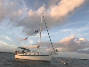 Albion flying her flags in the John Pennekamp State Park mooring field the morning after our tow from Rodriguez Key