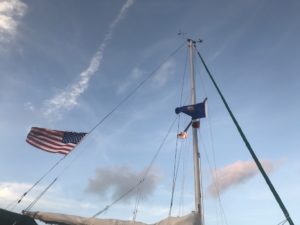 OCC Burgee adorning the port flag halyard while the PYC and Hope burgees fly adjacent, somewhere in the Carolinas