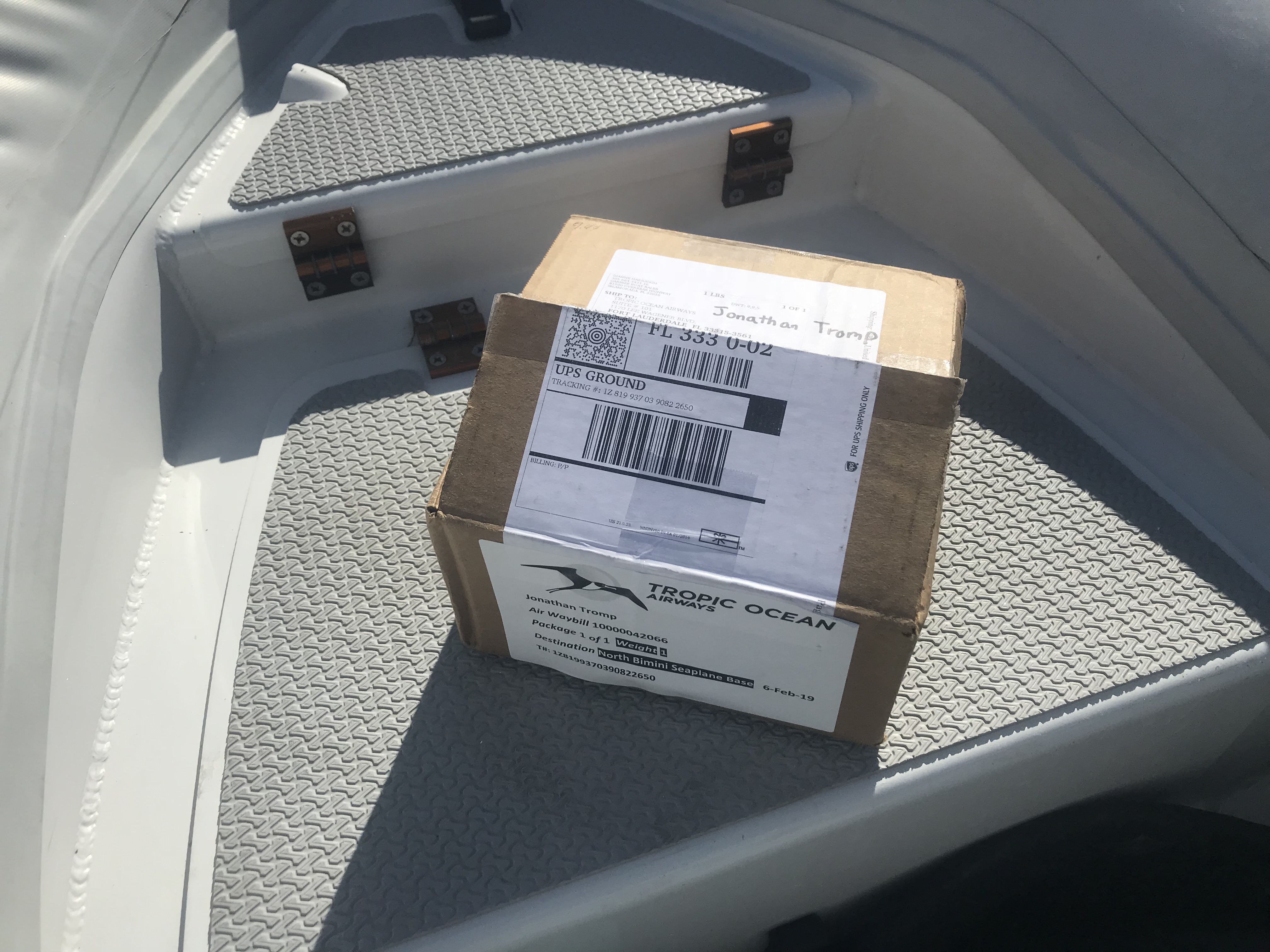 The next morning, to troubleshoot the problem, I started with the spark plug. Though there are multiple spare plugs buried deep somewhere in the catacombs of an overstuffed Albion, now that I needed them, they evaded discovery, leading to a trip to the Yamaha dealer who claimed it was a “specialty” plug and therefore not something they stock, requiring stops at several auto stores before finding the proper plug at NAPA.  After replacing the plug and ruling that out as the source our problems, and moving onto tracing fuel through the fuel system, which like the like the plug, was ruled out, Tim arrived to help take apart the carburetor. Though the carburetor had been cleaned before leaving Michigan, and again in Key West only weeks earlier, it seemed the logical culprit in the scenario. Upon removal, it was evident that the carburetor was indeed suffering the consequences of Ethanol (which as far as I know had not been in the fuel since the motors time on the Chesapeake, unless Key West was the source), so, Phil from Pappillon who was out provisioning, grabbed a can of carb cleaner for us and we went about a dockside carb tear-down. After all that effort, still no luck. Being that it was a Friday and we were scheduled to take advantage of the short weather window predicted for Sunday, it was imperative that we found a replacement carburetor quickly. Tim, the dockmaster at Pennekamp helped locate Yamaha dealers throughout the Keys in an effort to source the part, and thankfully, one of the dealers he discovered claimed they could likely have the carb, for about $100 overnight shipping, by 11:00 AM Saturday. Come 11:00 Saturday, with Dockmaster Tim’s son enroute to pick up the part, and no word from the dealer, it was admitted after calling them that the part had not arrived – claiming it was routed through Kentucky and stranded from a supposed winter storm. Now, faced with our desperately needed carburetor sitting in Kentucky and our wallet unnecessarily $100 lighter, we began searching for a Plan B. Enter again, Dockmaster Tim who informed us of TropicOcean Airways who, a few years prior, flew a windlass into the Bahamas for him. Being the weekend, and knowing that I would be leaving the next day for our crossing and out of communication until getting our BTC cell service set-up in Bimini, my father began coordinating between the Key’s Yamaha dealer and TropicOcean Airways, who represented that if the part arrived to them by 13:00 on Tuesday, it would be on the afternoon seaplane into Bimini. So, the package that finally arrived into Marathon on Monday was once again overnighted, this time to Ft. Lauderdale, where it was confirmed by UPS as having been delivered at 12:26. With the indicated timely delivery of the package, Tim from Ohana and I headed into North Bimini to meet the seaplane, which arrived without our much needed package. After discussing with the pilot, who called the office to inquire regarding the whereabouts of our little carburetor, which at that point was nowhere to be found. It was later learned that UPS initially delivered the package to the wrong address.