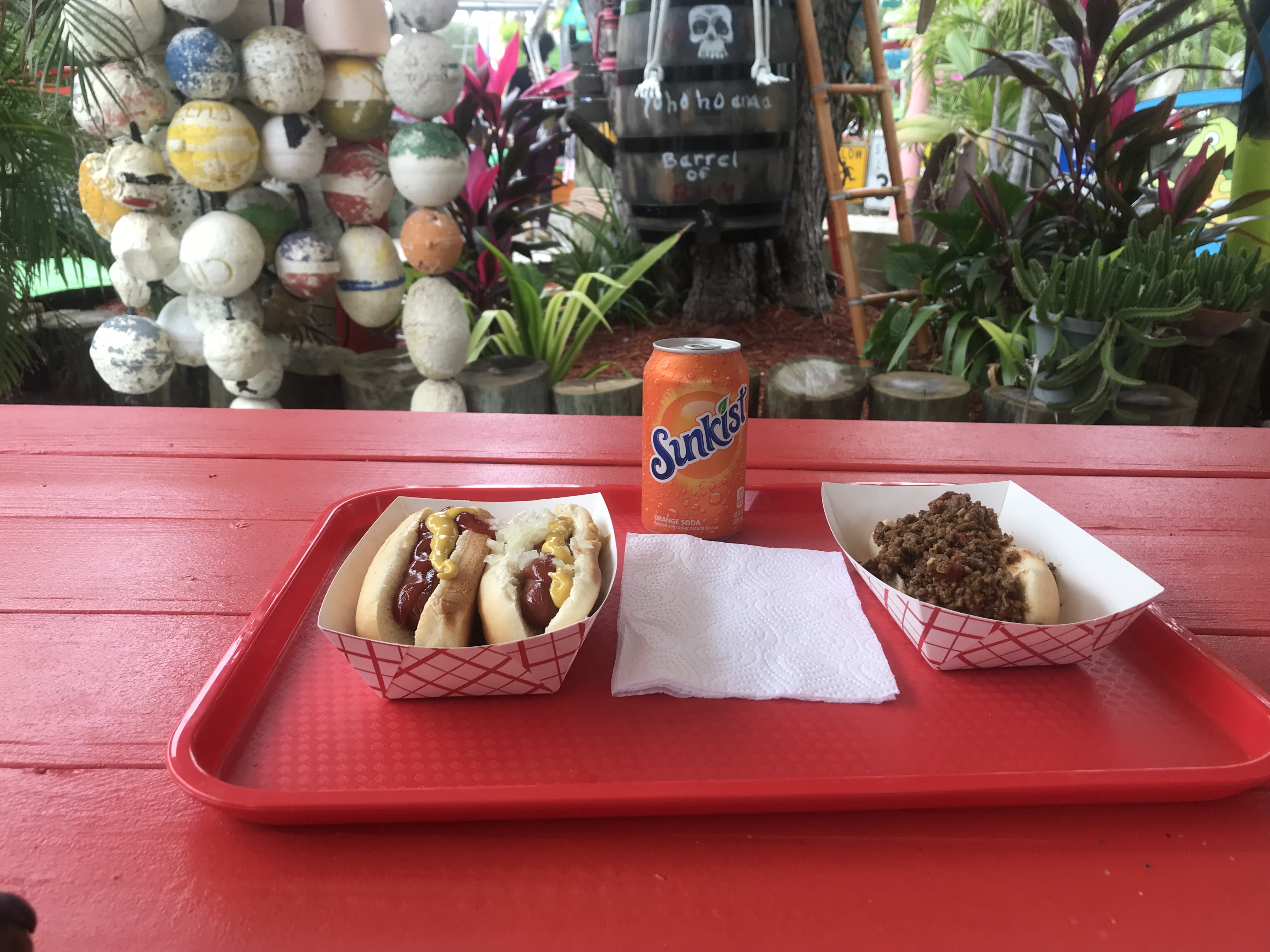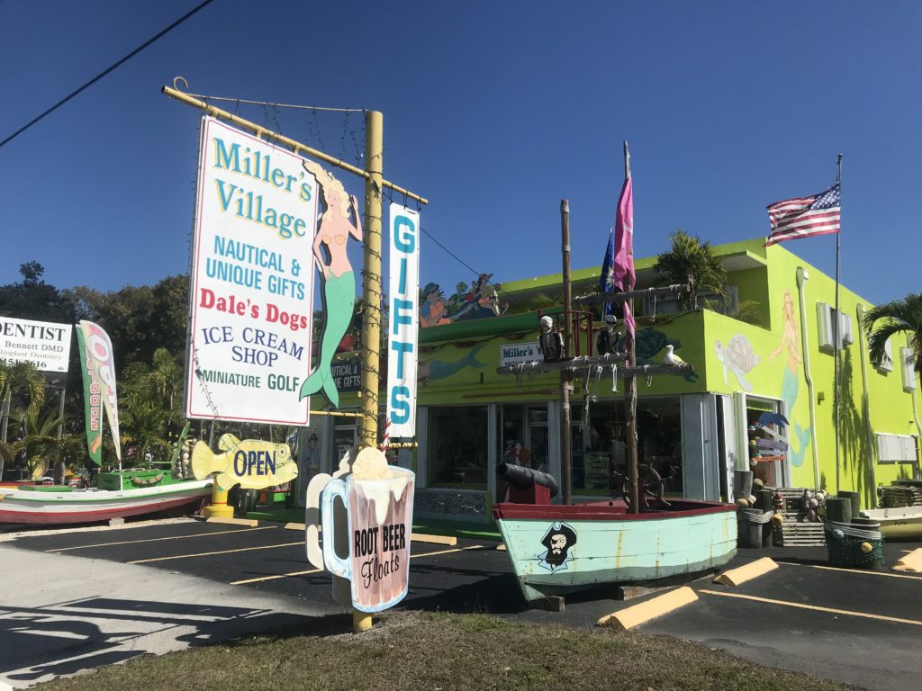 While in Key West, Ziggy and I, nearly every morning, walked into the Historic Seaport for a café con leche, served with a smile and piece of bacon for Ziggy, from Eko at Fisherman’s Cafe. Those morning jaunts became some of our best memories from our time there and one of the hardest parts of having to say goodbye to Key West. With the circumstances under which we found ourselves initially “stuck” in Key Largo and John Pennekamp Coral Reef State Park, and the memories of our Fisherman’s Café experiences fresh in our minds, finding a comforting “third space” to walk to with Ziggy to peruse the news and even get a cup of coffee was an important step in “making the best of it.”  It was the mermaid laden sign out front indicating hot dogs and root beer floats that initially attracted us, during our walk the morning following our town into Pennekamp, to Miller’s Village. Though the promise of a cold sugary root beer float was the hook in our mouth, we were pleased to find that Dale’s Dog’s, located through the nautical flotsam decorated courtyard, offered inexpensive coffee and $1 hot dogs – enticing for a frugal former accountant trying to preserve the provisions we had aboard Albion for our eventual departure to the Bahamas. Over the course of our daily coffee runs, Miller’s Village became more than a place to grab a cup of coffee and cheap meal, it became a little oasis from the frustrations of broken motors and uncooperative weather, and one where we were greeted each day by a couple who genuinely cared for us and sought to assist in whatever way possible – be it the use of his workshop, a bike for running to West Marine, or simply a smile and distracting conversation after an obviously frustrating phone call with a supplier.  The love shown to us by Dale and Beth is something for which we will be forever thankful and look back upon with fondness as we reflect on this great journey.