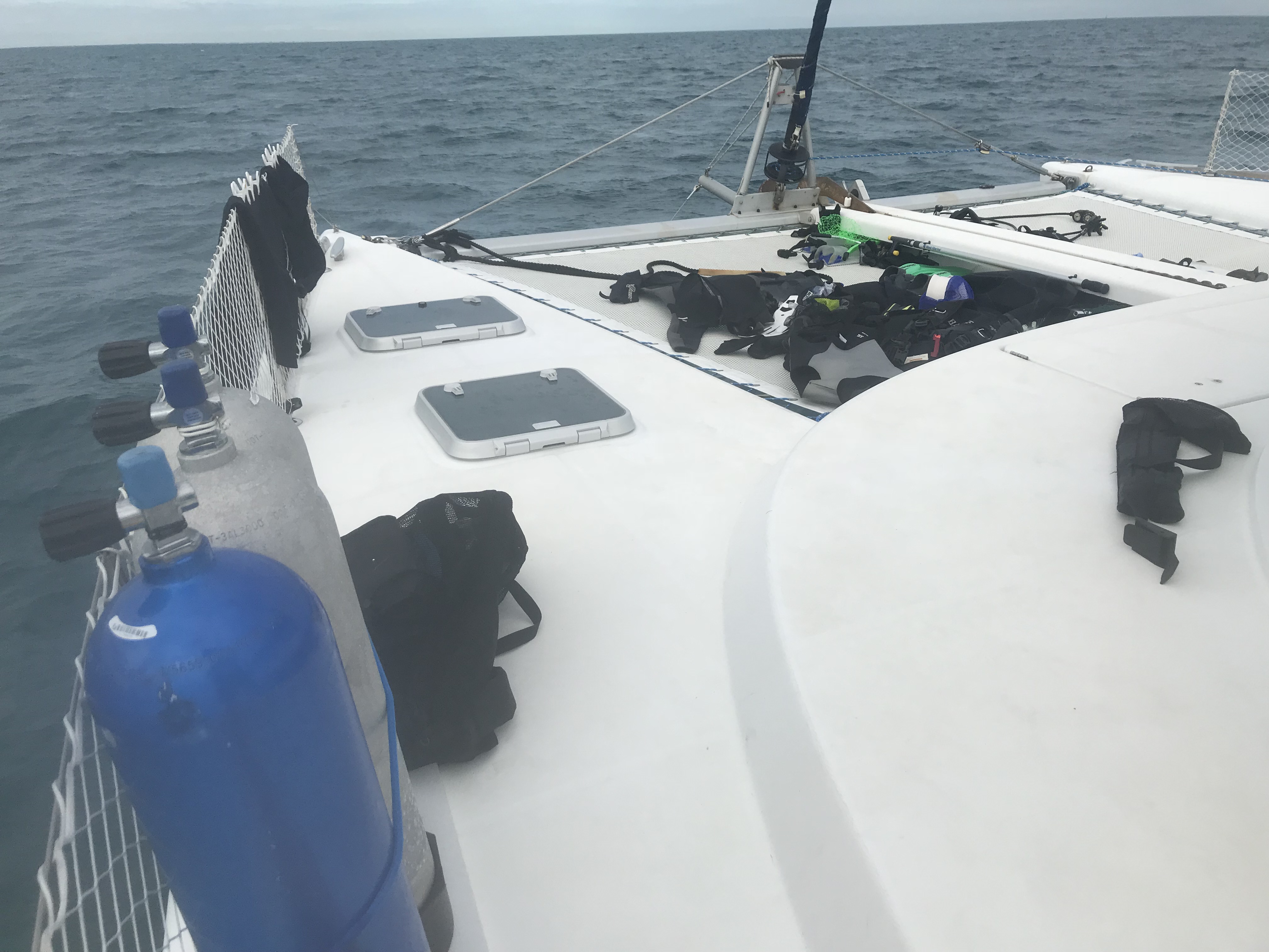 Dive gear drying on Ohana’s trampoline after our snorkel and lobster excursion. Perhaps another selling point for multi-hulls…