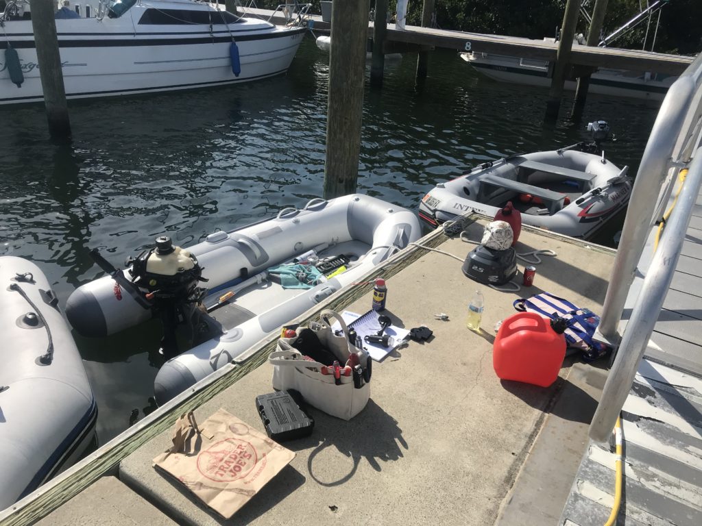 Dockside carburetor job at the Pennekamp dinghy dock